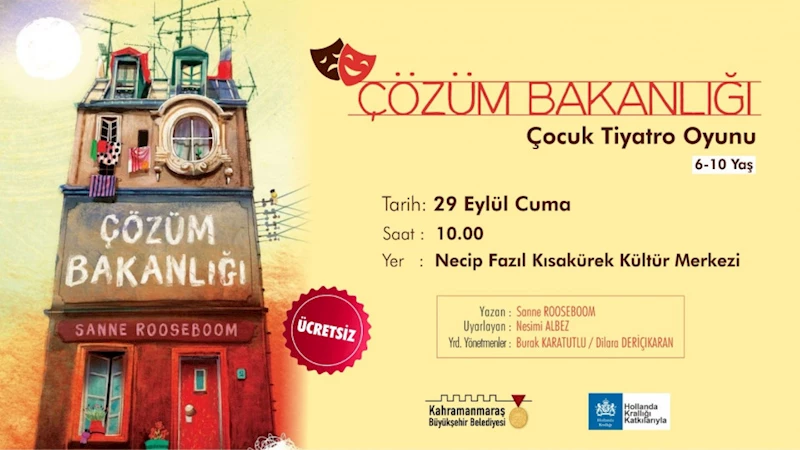 Hollanda Büyükelçiliği’nin destekleriyle hayata geçirilen proje kapsamında daha önce şehir merkezinin yanı sıra Afşin ve Göksun’da da çocuklarla buluşturulan ve büyük beğeni toplayan ‘Çözüm Bakanlığı’ adlı tiyatro gösterisi, 29 Eylül Cuma günü bir kez daha Necip Fazıl Kısakürek Kültür Merkezi’nde sahne alacak. İlham verici, eğlenceli ve macera dolu hikâyesiyle akran zorbalığına göğüs geren bir grup arkadaşın yaşadığı olayları konu alan gösteri, saat 10.00’da perdelerini açacak. Büyükşehir Belediyesi’nden yapılan açıklamada, sosyal belediyecilik hizmetleri çerçevesinde farklı yaş gruplarına yönelik kültür sanat etkinliklerinin devam edeceği belirtildi.