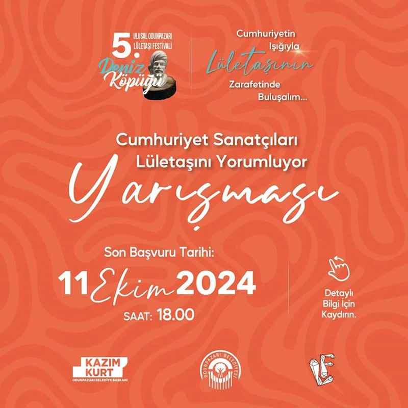 Odunpazarı Belediyesi, bu yıl 5. kez yapılacak Ulusal Lületaşı Festivali (Deniz Köpüğü) kapsamında "Cumhuriyet Sanatçıları Lületaşını Yorumluyor" yarışması düzenliyor. Yarışma için başvurular, 11 Ekim 2024 tarihinde saat 18.00'de sona erecek.