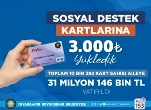 Diyarbakır Büyükşehir Belediyesi, aralık ayında ihtiyaç sahibi yurttaşlara yönelik sosyal destek çalışmaları kapsamında 10 bin 382 kişinin SODES Kartına 3 bin TL yatırarak toplam 31 milyon 146 bin TL destek sağladı.