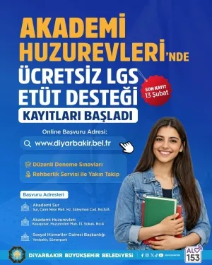 Diyarbakır Büyükşehir Belediyesi, Akademi Huzurevleri Etüt Merkezi’nde Liselere Geçiş Sistemi (LGS) sınavına hazırlanan öğrencilere ücretsiz eğitim desteği sağlamak amacıyla başvuru almaya başladı.