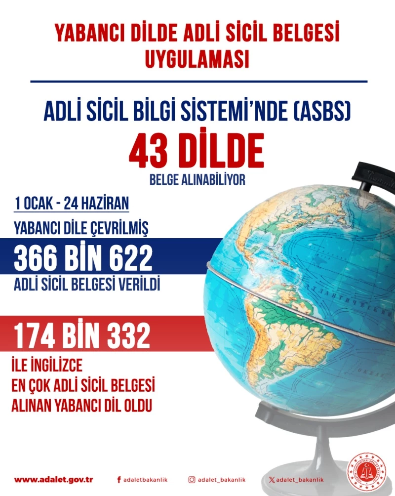Bu yıl 1 Ocak’tan 24 Haziran 2024’e kadar geçen süre boyunca 43 yabancı dilde 366 bin 622 adli sicil belgesi verildi. 174 bin 332 ile en çok adli sicil belgesi alınan yabancı dil İngilizceyi, 44 bin 67 ile Almanca ve 16 bin 504 ile Fransızca takip etti.