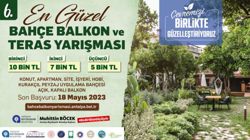 Antalya’da yeşil dokunun, vatandaşların çevreye olan ilgisinin ve çevre bilincinin arttırılması, çevreyi güzelleştirmek, görsel kalitesi yüksek kentsel mekânlar yaratmak, toplumun çiçek ve diğer süs bitkilerine olan ilgisini arttırmak, sürdürülebilir yeşille bütünleşmiş yaşam alanları oluşturmak ve iklimsel değişimlerden kaynaklı su sıkıntısına dikkat çekmek amacıyla düzenlenen 6’ncı En Güzel Bahçe, Balkon ve Teras Yarışması Muratpaşa, Kepez, Konyaaltı, Döşemealtı ve Aksu ilçelerini kapsıyor. Yarışma başvuruları, 3 Nisan - 18 Mayıs tarihleri arasında Antalya Büyükşehir Belediyesi'ne elden teslim ya da web sayfası üzerinden yapılacak.