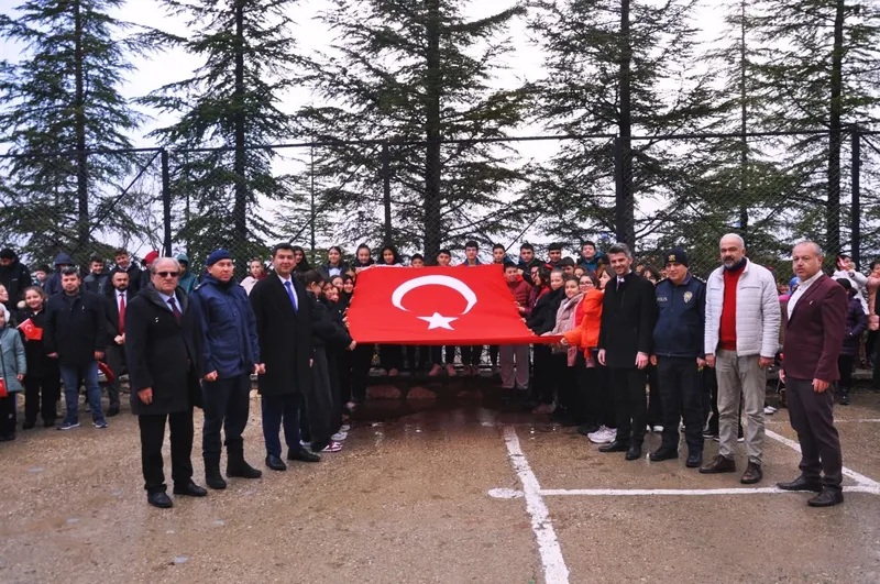 Öğrenci ve öğretmenlerin yoğun katılımıyla gerçekleşen etkinlikte, katılımcılar bayraklar eşliğinde İstiklal Marşı'nı coşkuyla okudu.