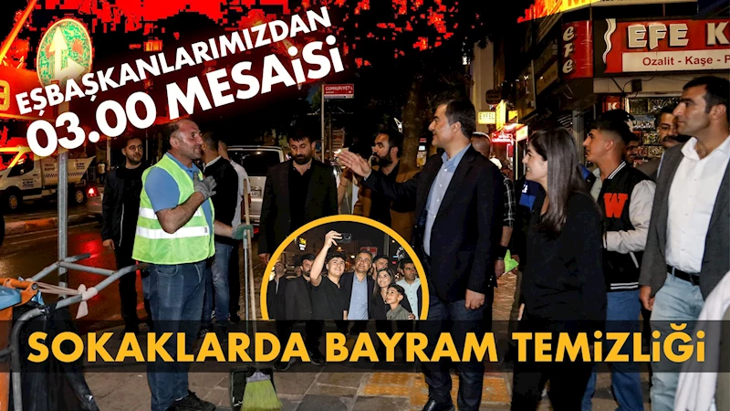 Cumhuriyet Caddesi boyunca yurttaşların yoğun ilgisi arasında çalışmaları takip eden Eşbaşkanlar, Cadde yıkama çalışması yaptı. Bir süre Cumhuriyet Caddesi’nde dolaşarak, çalışmaları yerinde takip eden Eşbaşkanlar, bayramı mesaide karşılayan belediye çalışanları, cadde esnafı ve yurttaşların bayramlarını kutladı.
