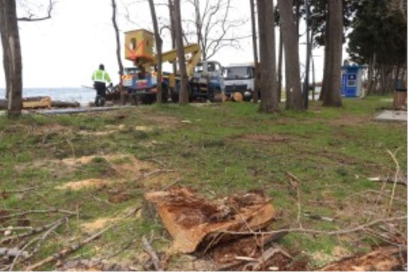 Hafta sonu fırtına nedeniyle Doğu Sahil Bandında çürüyen ağaçların devrilmesi sonucu Yalova Belediyesi Park Bahçeler Birimi, Doğu Sahil Bandında tehlike arz eden ağaçların kesim ve budamasını gerçekleştiriyor. Fırtınada zarar gören ağaçların yerine ise iki katı fidan dikimi yapılacak.