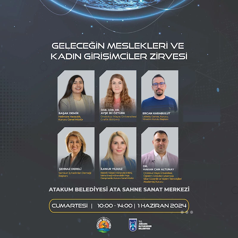 Geleceğin Meslekleri Zirvesi, 1 Haziran Cumartesi günü saat 10.00’da başlayacak. Ankara Büyükşehir Belediyesi Projeler Şube Müdürü Ömer Faruk Sarı’nın moderatörlüğünde gerçekleştirilecek programın birinci oturumunda Başak Demir (Helimore Havacılık Kurucu Genel Müdürü), Dr. Ayşe İri Öztürk (Ondokuz Mayıs Üniversitesi Grafik Bölümü Öğretim Görevlisi), Ercan Karabulut (Lebleby Games Kurucusu ve Yönetim Kurulu Başkanı) söz alacak. Panelin ikinci oturumunda Şehnaz Dereli (Samsun İş Kadınları Derneği Başkanı), İlknur Yılmaz (Elektrik Yüksek Mühendisi-MBA, İdeha Enerji Mühendislik Proje Danışmanlık Kurucu Genel Müdürü), Dr. Hakan Can Altunay (Ondokuz Mayıs Üniversitesi’nde Öğretim Görevlisi, Cybernova Siber Güvenlik ve Yazılım Teknolojileri Akademisi Kurucusu) katılımcılara önemli bilgiler verecek.