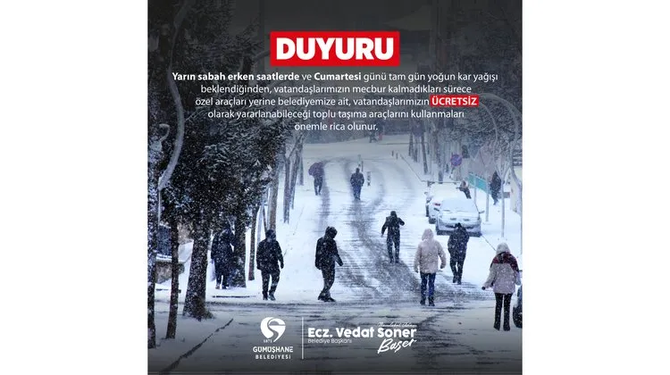 Gümüşhane Belediyesi, kamuoyunu bilgilendirmek amacıyla resmi bir duyuru yayımladı. Duyuru, belediyenin resmi kanalları aracılığıyla paylaşıldı.