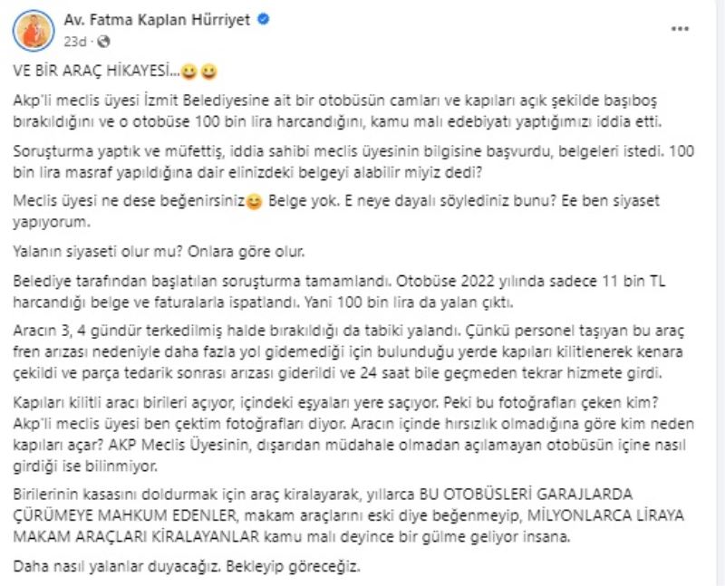 İzmit Belediye Başkanı Fatma Kaplan Hürriyet, AKP’li meclis üyesi Halil Atay’ın belediyeye ait otobüsün başıboş bırakıldığı iddia ettiği ve soruşturma sonrası yalan olduğu ortaya çıkan paylaşımına yanıt vererek: Birilerinin kasasını doldurmak için araç kiralayarak, yıllarca bu otobüsleri garajlarda çürümeye mahkûm edenler, milyonlarca liraya makam araçları kiralayanlar kamu malı deyince bir gülme geliyor” dedi