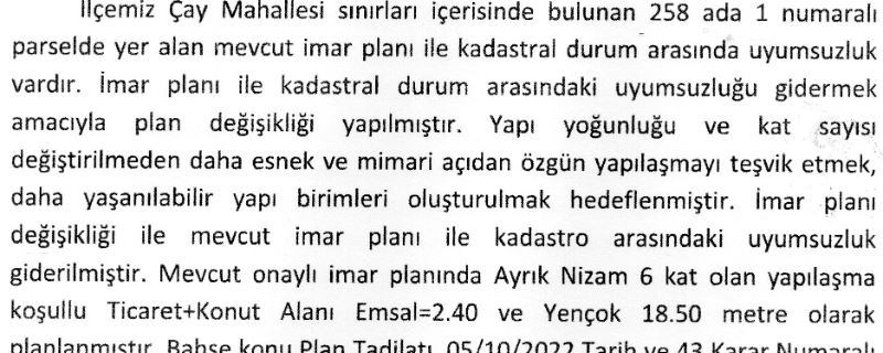 İlçemiz Çay Mahallesi sınırları içerisinde bulunan 258 ada 1 numaralı parselde yer alan mevcut imar planı ile kadastral durum arasında uyumsuzluk vardır. İmar planı ile kadastral durum arasındaki uyumsuzluğu gidermek amacıyla plan değişikliği yapılmıştır. Yapı yoğunluğu ve kat sayısı değiştirilmeden daha esnek ve mimari açıdan özgün yapılaşmayı teşvik etmek, daha yaşanılabilir yapı birimleri oluşturulmak hedeflenmiştir. İmar planı değişikliği ile mevcut imar planı ile kadastro arasındaki uyumsuzluk giderilmiştir. Mevcut onaylı imar planında Ayrık Nizam 6 kat olan yapılaşma koşullu Ticaret+Konut Alanı Emsal=2.40 ve Yençok 18.50 metre olarak planlanmıştır. Bahse konu Plan Tadilatı 05/10/2022 Tarih ve 43 Karar Numaralı Meclis Kararı 1/5000 Nazım İmar Planı ve 1/1000 İlave İmar Planı paftaları onaylanmıştır. Söz konusu Plan Tadilatına ait çalışmalar, belediyemiz ilan panosunda, İmar ve Şehircilik Müdürlüğümüzde 24/10/2022 Tarihinde 1 ay süre ile (mesai bitimine kadar) askıya çıkarılmıştır.24/10/2022