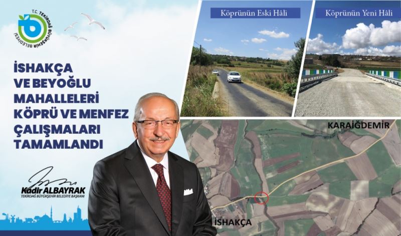 Kurulduğu günden bu yana Tekirdağ’ın daha yaşanılabilir bir kent olması hedefiyle alt ve üst yapı alanında önemli projeleri hayata geçiren Tekirdağ Büyükşehir Belediyesi, Tekirdağ il genelinde 2023 yılı sonuna kadar tamamlanacak olan köprü ve menfez çalışmalarına devam ediyor. Bu kapsamda İshakça ve Beyoğlu Mahallelerinde köprü ve menfez çalışmaları tamamlandı.