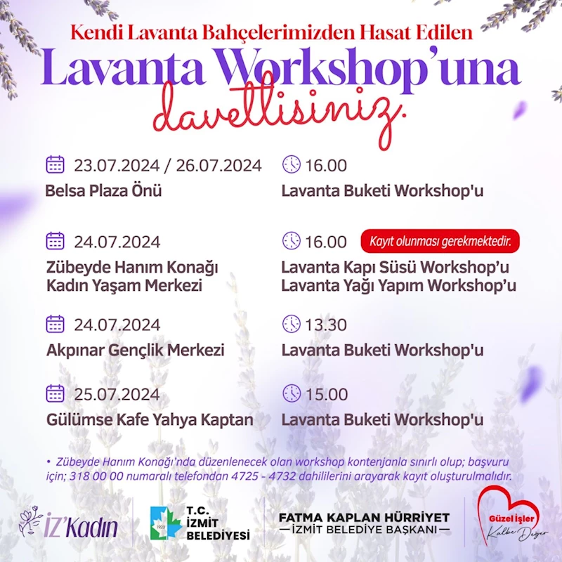 Hasadı yapılan lavantalar, Kadın ve Aile Hizmetleri Müdürlüğünün düzenleyeceği workshoplarla buket haline getirilecek. İzmit’te dört gün boyunca farklı noktalarda gerçekleştirilecek olan bu özel etkinliğe tüm vatandaşlar davetli.