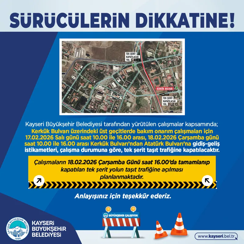 Çalışmalar 17-18 Şubat 2026 tarihlerinde, saat 10.00 ile 16.00 arasında yapılacak. Bu süreçte Kerkük Bulvarı'ndan Atatürk Bulvarı'na gidiş ve geliş istikametlerinde, çalışmanın durumuna bağlı olarak tek şerit trafiğe kapatılacak. Sürücülerin alternatif güzergahları kullanmaları öneriliyor.