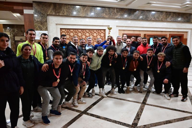 Futbolcularla tek tek selamlaşan ve sohbet eden Belediye Başkanı Topaloğlu, elde ettikleri şampiyonluk dolayısıyla hem futbolcuları hem de teknik heyeti tebrik etti.
