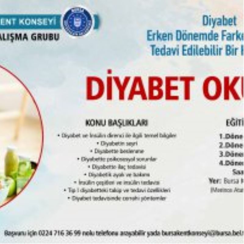 Bursa Kent Konseyi Sağlık Çalışma Grubu tarafından “Diyabet ‘erken dönemde fark edildiğinde’ tedavi edilebilir bir hastalıktır” sloganıyla düzenlenen Diyabet Okulu, 14 Ocak Cuma günü saat 14.30’da Bursa Kent Konseyi Koza Salonu’nda açılıyor. 4 farklı dönemde gerçekleşecek eğitimlerde, konusunda uzman doktorlar tarafından katılımcılara 10 oturumda diyabet ile ilgili bilgiler verilecek.