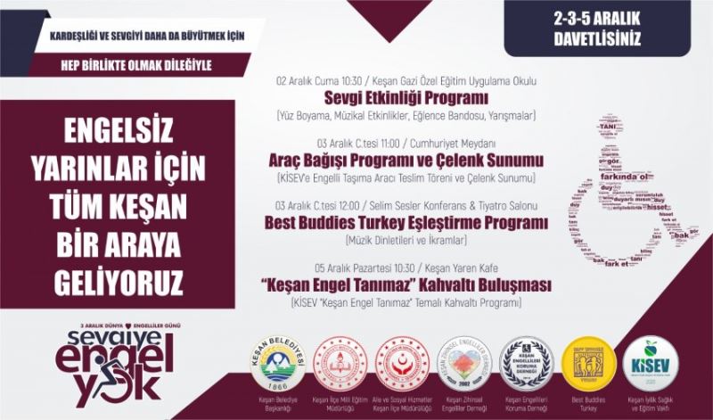 Keşan Belediyesi, Keşan İlçe Milli Eğitim Müdürlüğü, Aile ve Sosyal Hizmetler Keşan İlçe Müdürlüğü, Keşan Zihinsel Engelliler Derneği, Keşan Engellileri Koruma Derneği, Best Buddies Turkey ve Keşan İyilik, Sağlık ve Eğitim Vakfı işbirliği ile düzenlenecek programlar 2 Aralık Cuma, 3 Aralık Cumartesi ve 5 Aralık Pazartesi günlerinde gerçekleştirilecek