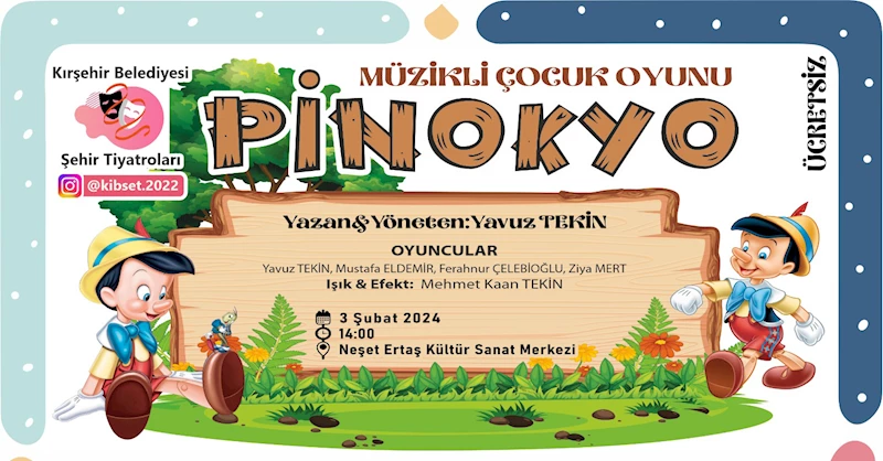 2024 Cumartesi günü saat 14:00’da Pinokyo adlı müzikli çocuk oyunu ile; 4 Şubat