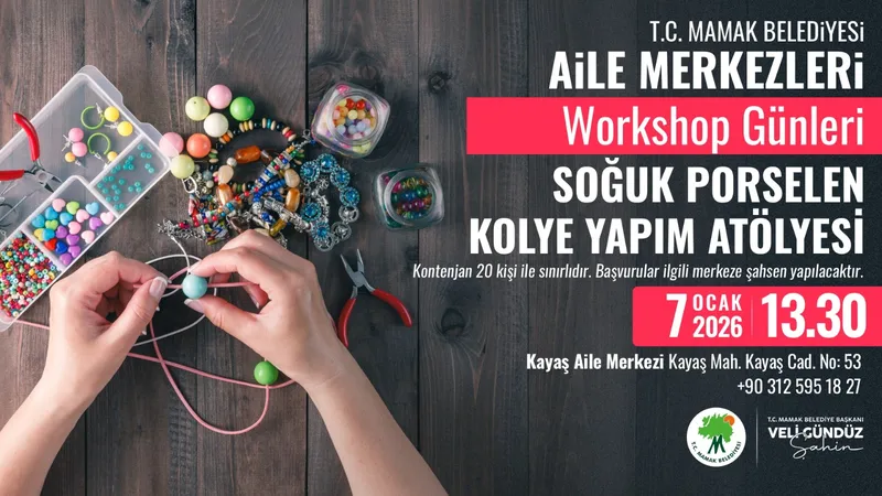 Aynı gün gerçekleştirilecek ikinci etkinlik ise Kayış Aile Merkezinde yapılacak. "Soğuk Porselen Kolye Yapım Atölyesi", saat 13.30'da başlayacak. Katılımcılar, soğuk porselen tekniğiyle kendi özgün kolyelerini tasarlama imkânı bulacak. Kontenjanı 20 kişi ile sınırlı olan bu çalışma için de başvurular şahsen alınacak.