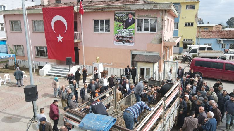 Arslanlı Mahallesi’nde düzenlenen dağıtım töreninde, üreticilere 10’arlı şekilde düzenlenmiş bağlarda incir fidanları verildi.