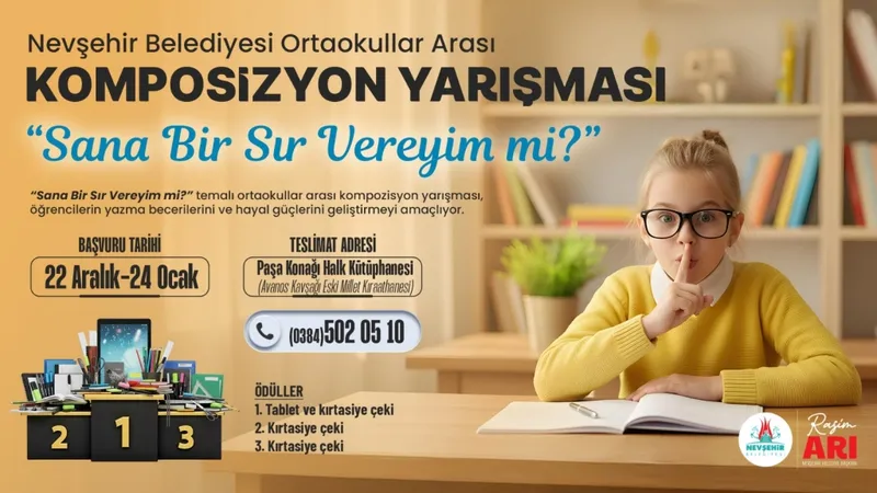 Nevşehir Belediyesi, ortaokul öğrencileri arasında "Sana Bir Sır Vereyim mi?" temalı bir kompozisyon yarışması düzenleyeceğini duyurdu. Yarışma, Nevşehir Belediyesi Gençlik ve Spor Hizmetleri Müdürlüğü tarafından organize edilecek.