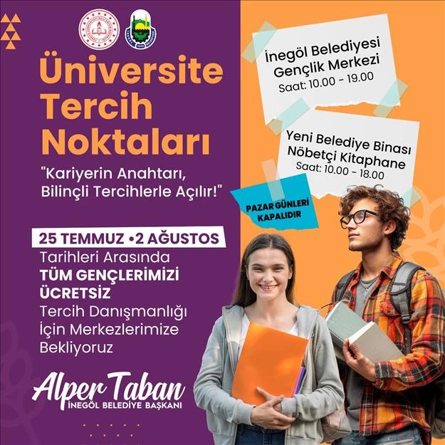 Hayatın her alanında var olan İnegöl Belediyesi, doğumdan ölüme kadar süren hizmet seferberliği kapsamında öğrencilerin de her an yanında. Dönem dönem öğrencilere yönelik etkinlik ve faaliyetler düzenleyen İnegöl Belediyesi, üniversite adayı öğrencilerini bu yıl da unutmadı. Zorlu bir sınav maratonunun ardından 25 Temmuz tarihinde başlayacak tercihler için öğrencilerin daha doğru yönlendirilmeleri adına İnegöl Belediyesi Üniversite Tercih Danışmanlığı Merkezi kuracak. İnegöl Belediyesi Gençlik Merkezi ile Yeni Belediye Binası Nöbetçi Kitaphane olmak üzere 2 noktada kurulacak merkezlerde, 02 Ağustos’a kadar hizmet verilecek.