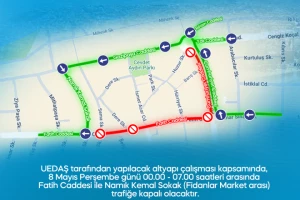 UEDAŞ tarafından yapılacak altyapı çalışması kapsamında, 8 Mayıs Perşembe günü 00.00 - 07.00 saatleri arasında Fatih Caddesi ile Namık Kemal Sokak (Fidanlar Market arası) trafiğe kapalı olacaktır.