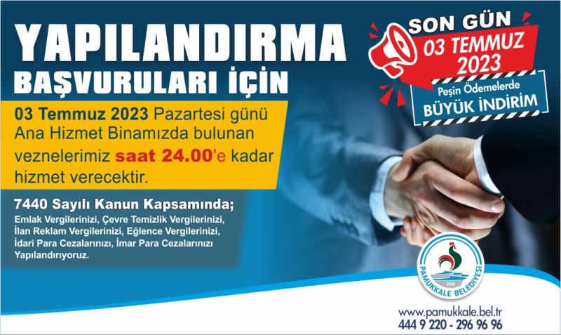 Pamukkale Belediyesi, Emlak, Çevre Temizlik, İlan Reklam, Eğlence vergileri ile İdari Para cezaları ve İmar Para cezalarında yapılandırmalarında süresinde son gün olan 3 Temmuz 2023 Pazartesi günü saat 24.00’e kadar veznelerin açık olacağını bildirdi.