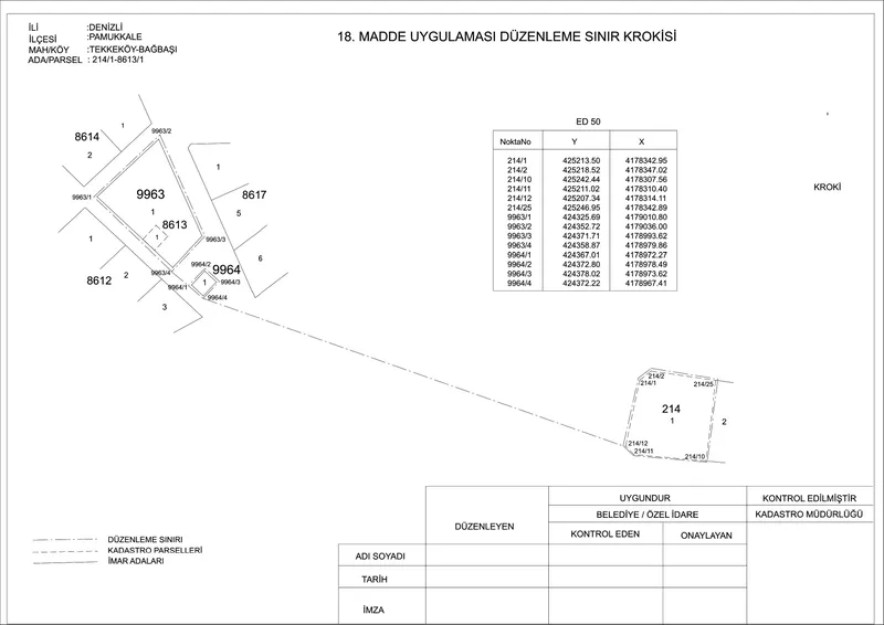 Denizli'nin Pamukkale İlçesi'nde, Bağbaşı Mahallesi 8613 ada 1 ve Tekkeköy Mahallesi 214 ada 1 nolu parselleri kapsayan alanda, Arsa ve Arazi Düzenlemeleri Yönetmeliği uyarınca hazırlanan parselasyon planı onay sürecini tamamladı. Plan, 26/11/2025 tarihli Pamukkale Belediyesi encümen kararı ile kabul edildikten sonra, 5216 sayılı Kanun gereği 11/12/2025 tarihli Denizli Büyükşehir Belediyesi encümen kararı ile de onaylandı.