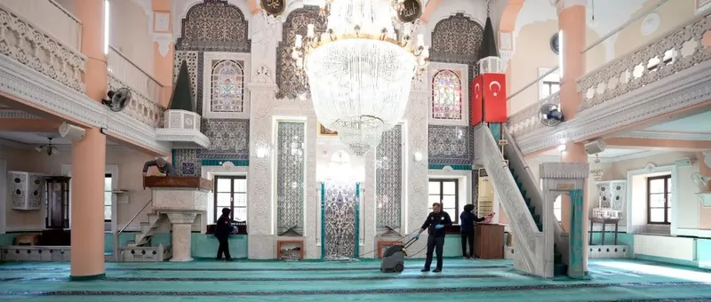 Pamukkale Belediyesi Destek Hizmetleri Müdürlüğü ekipleri, ibadethaneleri özel ekipmanlarla steril hale getirdi. Halılar hijyenik yöntemlerle yıkandı, camlar, minber ve mihrap gibi alanlar tozdan arındırıldı. Vatandaşların ortak kullanım alanları tamamen dezenfekte edilerek sağlıklı bir ibadet ortamı sağlandı.