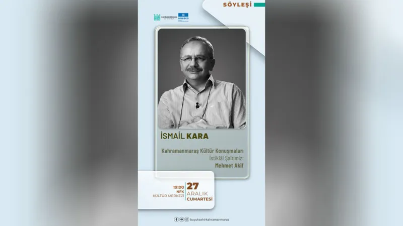 Kahramanmaraş Büyükşehir Belediyesi, 27 Aralık Cumartesi günü Prof. Dr. İsmail Kara'nın katılımıyla NFK Kültür Merkezi'nde "İstiklal Şairimiz: Mehmet Akif" konulu bir söyleşi gerçekleştirecek.