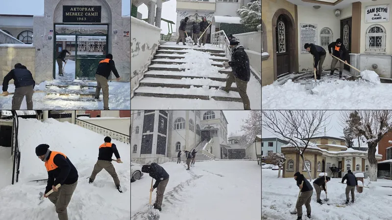 İbadetlerini yerine getirmek üzere camilere gelen vatandaşların herhangi bir olumsuzluk yaşamaması adına harekete geçen ekipler, cami girişleri, avlular ve çevresindeki yaya yollarında biriken karları temizledi. Kayganlığa karşı yapılan tuzlama çalışmaları ile güvenli geçiş sağlandı. Yapılan çalışmalarla camilere ulaşım kolaylaştırılırken, vatandaşların gönül rahatlığıyla ibadetlerini gerçekleştirmesi hedeflendi.
