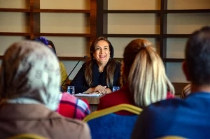 İran’ın Sîne kentinden gelen Tiyatro Yazarı Sîmîn Çayçî’nin söyleşide yaptığı konuşmanın çevirisini Kültür ve Sosyal İşler Dairesi Başkanı Zeynep Yaş yaptı.