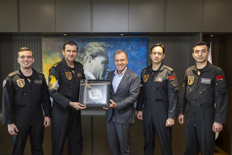 Mersin Büyükşehir Belediyesi Kültür ve Sosyal İşler Dairesi Başkanlığı tarafından Mersin’in kurtuluşunun 103. yıl dönümü dolayısıyla kentte gösteri gerçekleştirerek Mersin semalarında birbirinden güzel koreografiye imza atacak olan Türk Hava Kuvvetleri’nin akrobasi timi SOLOTÜRK Ekibi, Mersin Büyükşehir Belediye Başkanı Vahap Seçer’i ziyaret etti.