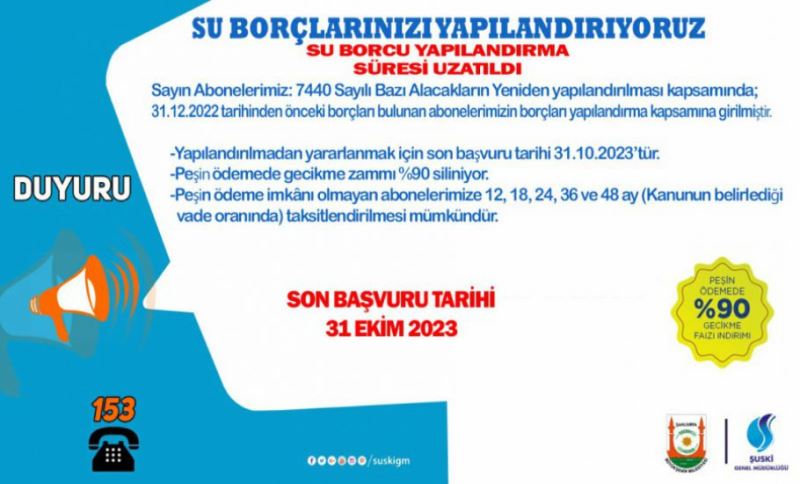 ŞUSKİ’den yapılan açıklamada, “ 7440 Sayılı yasa ile bazı alacakların yeniden yapılandırılması kapsamında abonelere borçlarını yeniden yapılandırma imkân sağlıyor. ŞUSKİ Genel Müdürlüğü Abone birimi tahakkuk servisine müracaat edilmesi halinde 31.12.2022 tarihinden önceki borçları bulunan abonelerin borçları yapılandırma kapsamına girilmiştir. Biriken borçlarını peşin ödemek isteyen abonelere yüzde 90 gecikme faizi indirimi uygulanacak. Yapılandırılmış borçlarda peşin ödeme imkânı olmayan abonelerimize 12, 18, 24, 36 ve 48 ay (Kanunun belirlediği vade oranında) taksitlendirilme kolaylığı sağlanacaktır. ŞUSKİ Genel Müdürlüğüne borcu olan aboneler 31 Ekim 2023 tarihi mesai bitimine kadar ŞUSKİ Abone birimi tahakkuk servisine müracaat edebilirler. Detaylı bilgi almak isteyen aboneler ayrıca Alo 153 Çağrı Merkezi'ni arayarak gerekli bilgileri alabilirler.” İfadelerine yer verildi.