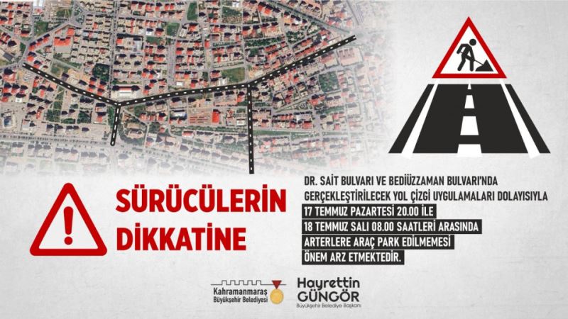 Şehrin ulaşım ağını güçlendirmek ve arterlerde konfor ve güvenliği artırmak için yol yenileme çalışmalarını kesintisiz sürdüren Kahramanmaraş Büyükşehir Belediyesi, Onikişubat ilçesinde Dr. Sait Bulvarı ve Bedüizzaman Bulvarı’nda tamamlanan asfalt çalışmalarının ardından gerçekleştirilecek yol çizgi uygulamaları dolayısıyla arterlere 17 Temmuz Pazartesi 20.00 ile 18 Temmuz Salı 08.00 saatleri arasında araç park edilmemesi konusunda sürücüleri uyardı. Büyükşehir Belediyesi’nden yapılan açıklamada, Dr. Sait Bulvarı ve Bedüizzaman Bulvarı’nda gerçekleştirilecek yol çizgi uygulamaları nedeniyle arterlere bugün 20.00 ile Salı günü 08.00 saatleri arasında araç park edilmemesi, parklanma için alternatif noktaların tercih edilmesisin önem arz ettiği belirtildi.