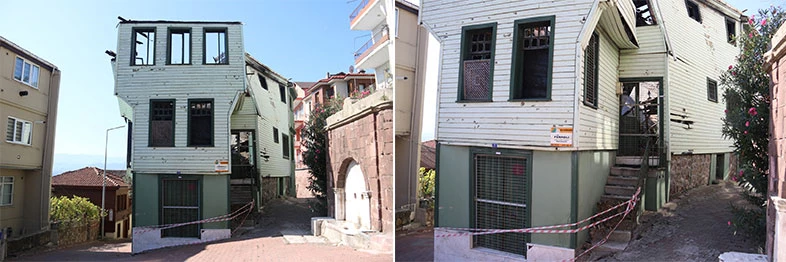 Büyükşehir Belediyesince projelendirme çalışmaları tamamlanan tarihi yapı yeniden gün yüzüne çıkıyor. Aslına uygun bir şekilde yapılan rekonstrüksiyon ahşap imalatları tüm katlarda tamamlandı. Tarihi yapıya yeniden hayat vermek için hummalı bir çalışma yürüten Büyükşehir ekipleri, bina konstrüksiyonu galvaniz bağlantı plakaları ile sabitleme işlemine devam ediyor. Diğer yandan cephelerin restorasyona özgü bağdadi çıta yapılması ve cephe duvar içleri harman tuğla yapımı sürdürülüyor. Dayanıklılığında artırıldığı yapıda tüm ahşap yüzeylerine yangın geciktirici sıvı sürülüyor. Büyükşehir, rekonstrüksiyon ve restorasyon projesine bağlı olarak imalatlara devam ediyor.