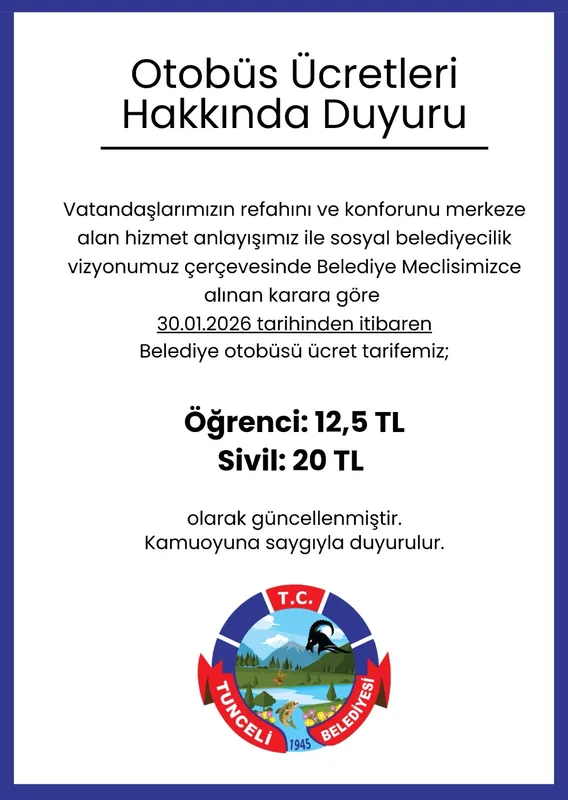 Tunceli Belediyesi, toplu taşıma hizmetlerinde yeni ücret tarifesini kamuoyuna duyurdu. Belediye Meclisi'nin kararıyla belirlenen bu tarifeler, 30 Ocak 2026 tarihinden itibaren geçerli olacak.