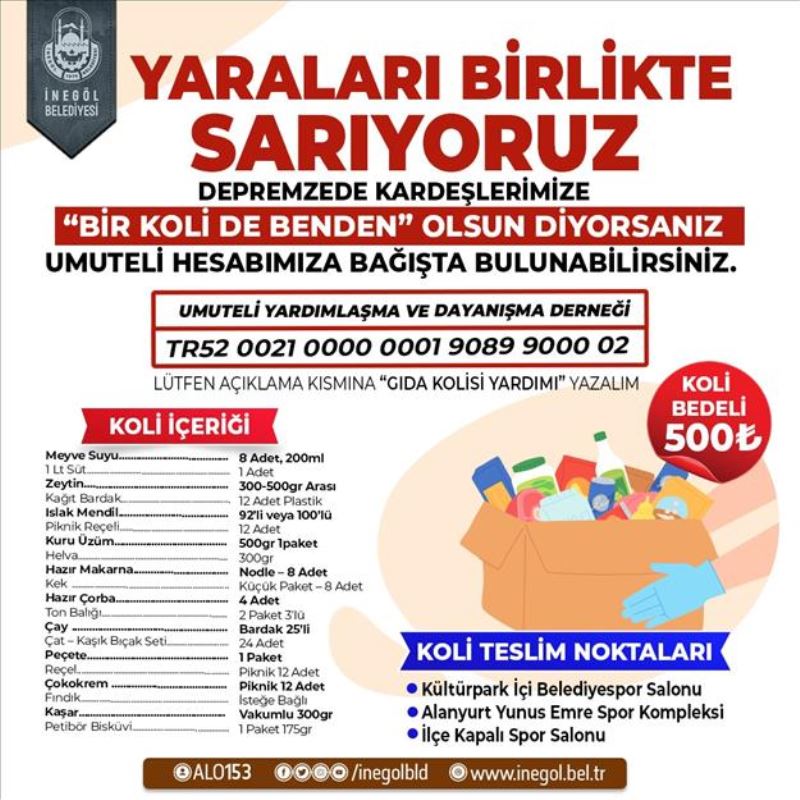İnegöl Belediyesi Umuteli Sosyal Yardım İşleri Müdürlüğü, Umuteli Yardımlaşma ve Dayanışma Derneği aracılığıyla gıda kolisi kampanyası başlattı. Bir koli bedelinin 500 TL olduğu, isteyen vatandaşların yardım toplama noktalarına da koli yardımı yapabileceği ifade edildi.