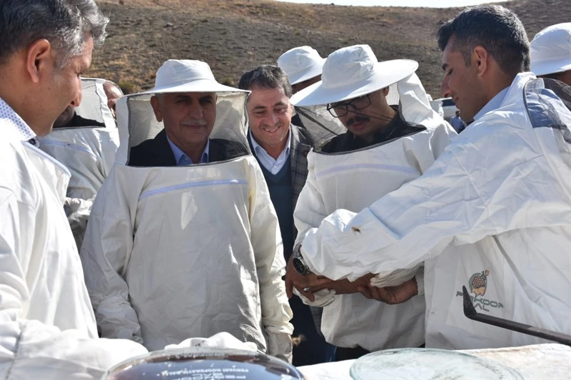Törende daha sonra özel arıca kıyafetlerini giyen Vali Kızılkaya, ilk sağımı yaptı.