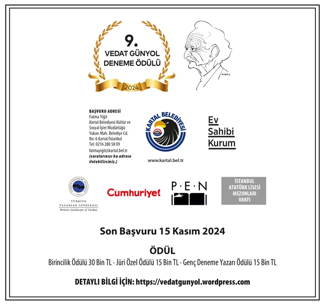 Kartal Belediyesi, Türkiye Yazarlar Sendikası, Cumhuriyet Gazetesi, P.E.N Türkiye Yazarlar Derneği ve İstanbul Atatürk Lisesi Mezunları Vakfı işbirliği ile gerçekleştirilecek olan 9. Vedat Günyol Deneme Ödülü’ne adaylar, deneme tarzında yazılmış eserlerle katılabilecek. Başvurular 31 Temmuz-15 Kasım 2024 tarihleri arasında yapılacak. Başvurular posta yoluyla alınacak.